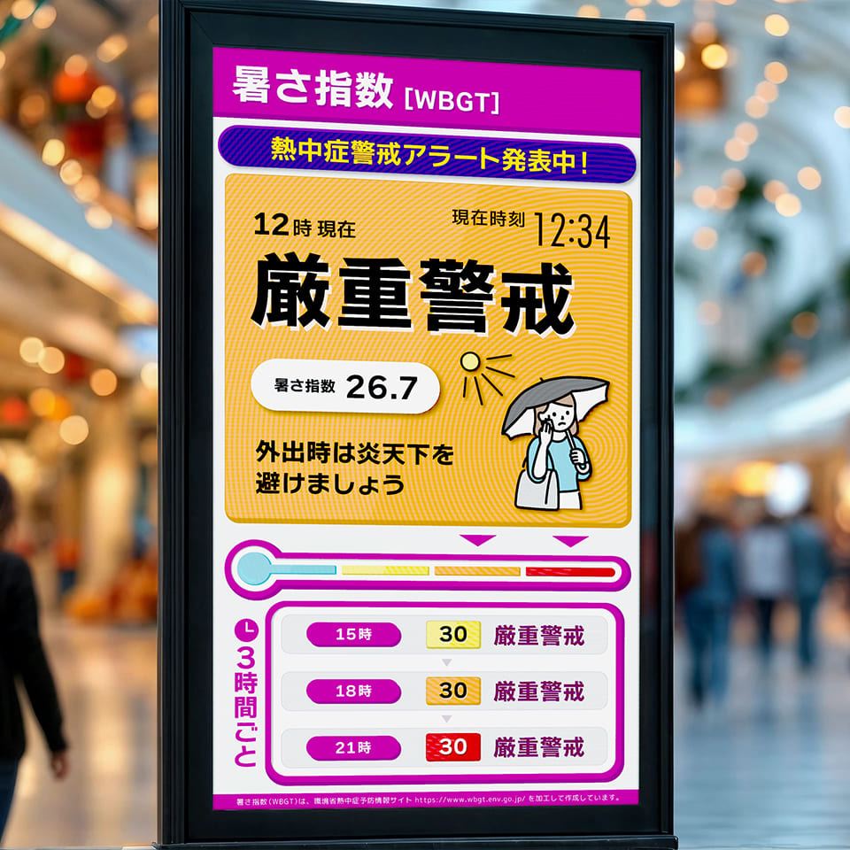 環境演出や飲食プロモーション動画、時報など豊富なコンテンツをご用意しています。新作も日々追加しており、お子様向けの遊びコンテンツや、熱中症警戒アラートのコンテンツは特にご好評を頂いております。