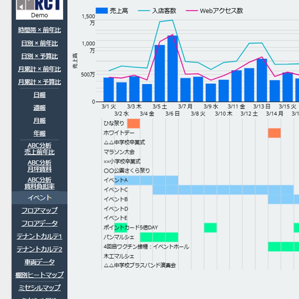 売上データ、賃料情報、プロモーション履歴、商圏分析、競合施設比較、インバウンドデータなど、多様な外部データと連携し、複合的な視点から経営状況を可視化します。